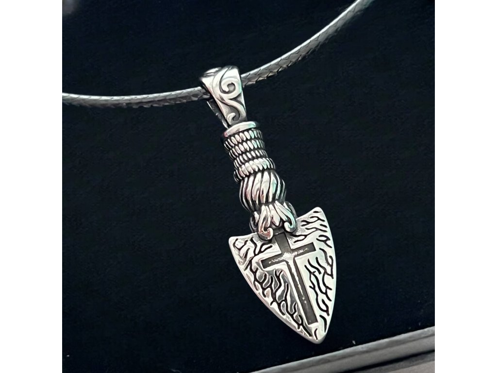 Stylový a kvalitní náhrdelník z nerezové oceli. Šíp s křížem, který je posazený na velmi kvalitním pásku z PU kůže a nerezové oceli s magnetickým zapínáním a pojistkou.
