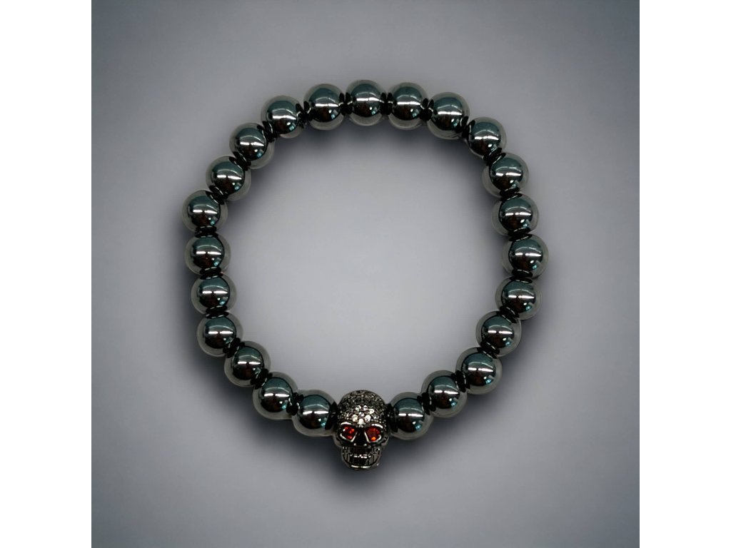 Náramek minerální černý hematit s lebkou se zirkony je na pohled velmi luxusní a lesklý. Zároveň si sebou nese nádech tajemna a originality.