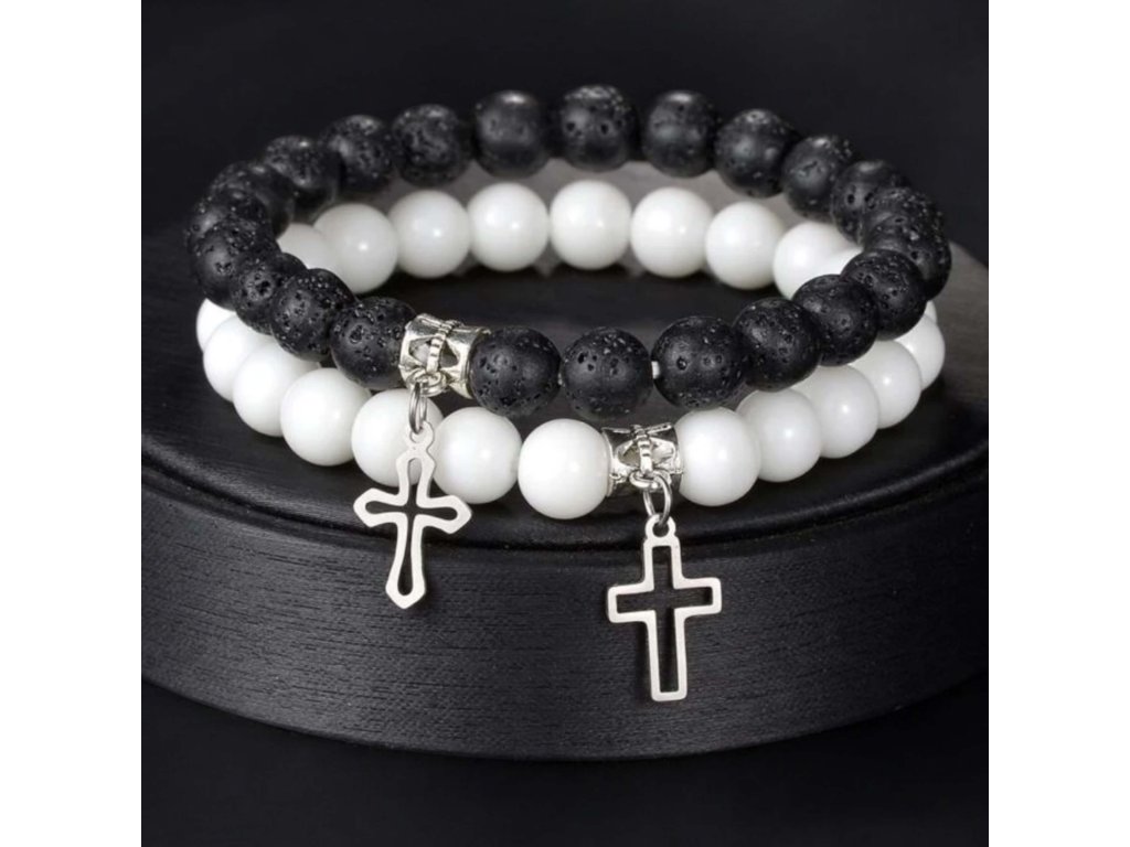 Náramek minerální párový z bílého onyxu a lávy. Ozdobený přívěškem (křížkem), který Vás společně ochrání.